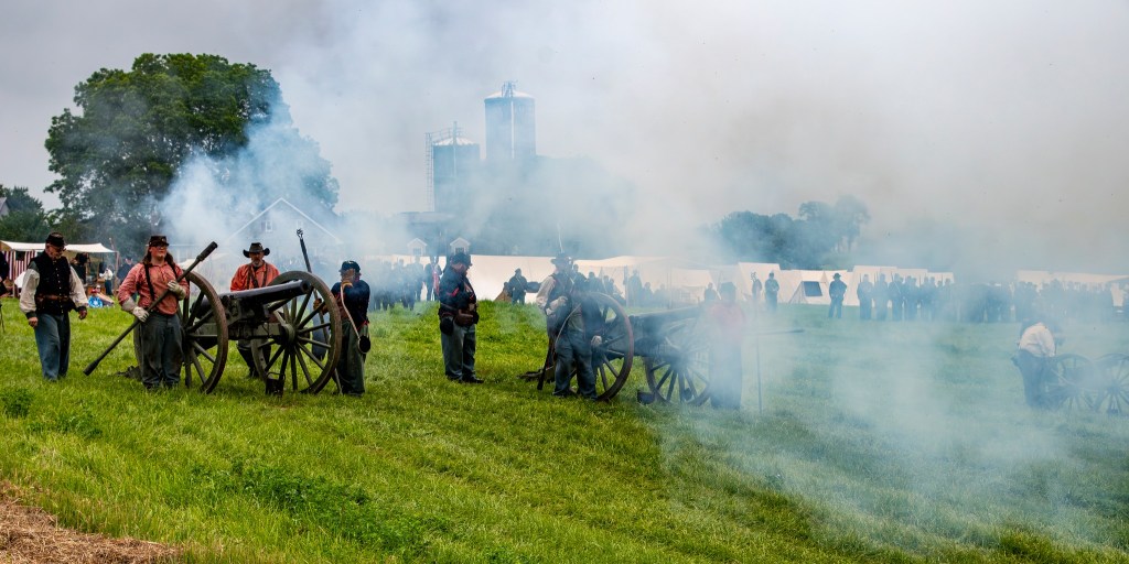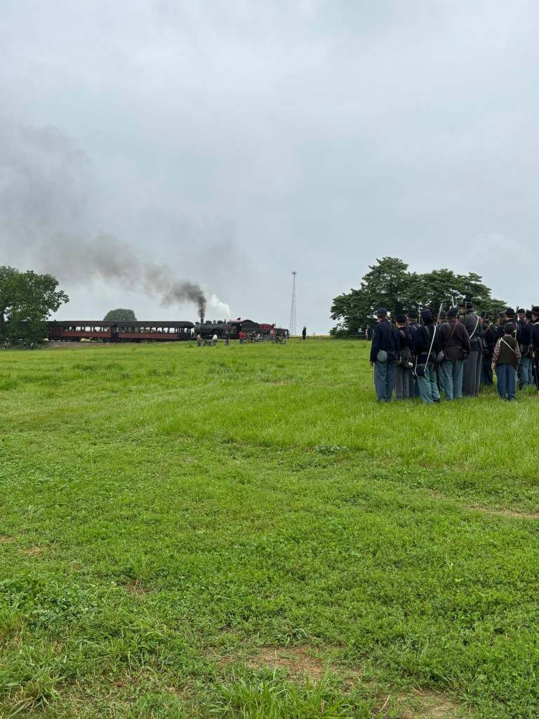 In the morning we marched the remaining distance, and joined with the rest of the company at Cherry Crest Farm. Our company’s turnout was fairly small, so we merged with men from the 142nd PA, 45th PA, and Lancaster Fencibles to form a single company. At 10:00 we marched out to battle. In the ensuing fight, we were hard pressed by the enemy, and eventually driven from the field. The company engaged in a brief drill, and was then called into formation and marched to the nearby train stop. After boarding the train, we travelled to Strasburg Station, then east to Paradise Junction, where we found Rebel infantry and dismounted cavalry. We unloaded from the train and attempted unsuccessfully to clear the junction. After taking the train back to camp, the company was almost immediately thrown into combat again, this time managing to take the field with a gallant charge. Saturday evening there was a wedding in camp, and we were treated to a catered dinner.